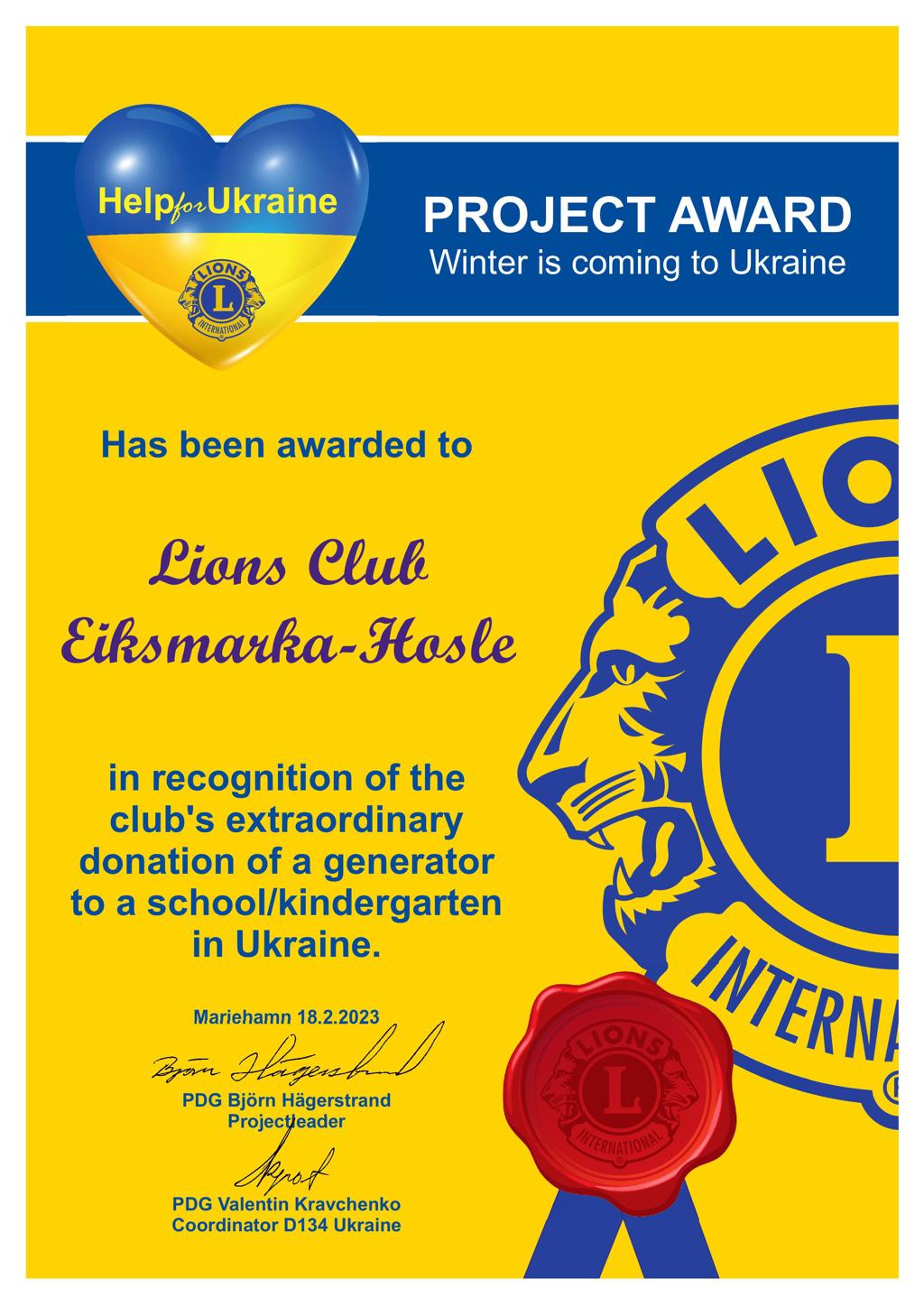 I samarbeid med Lions i 13 land i Europa startet vi innsamling av midler til aggregater den 1.12-2022. I løpet av 45 dager ble det samlet inn kr 800.000 i vårt distrikt. I tillegg fikk vi støtte fra katastrofefondet som stilte 500.000,- til disposisjon. Resultatet ble 130 aggregater betalt fra Lions i distrikt 104 E.